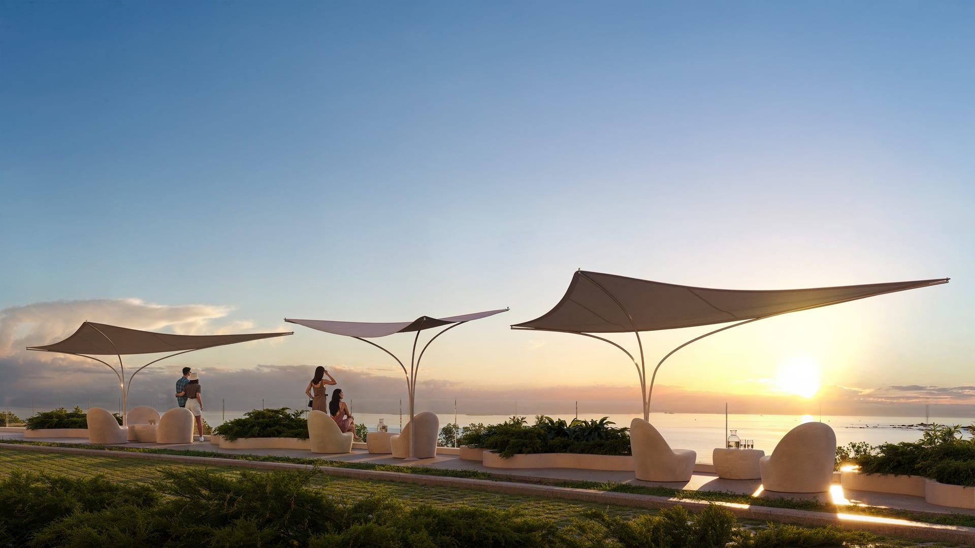 Терраса на крыше с видом на Адалары, Аю-Даг и бескрайнее Чёрное море. Зона отдыха с лаунж-мебелью, барная стойка и зона для мероприятий.